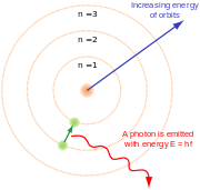 Bohr's theory represented electrons as orbiting the nucleus of an atom in a way that was amazingly different from what we see in the world of our everyday experience. He showed that when an electron changed orbits it did not move in a continuous trajectory from one orbit around the nucleus to another. Instead, it suddenly disappeared from its original orbit and reappeared in another orbit. Each distance at which an electron can orbit is a function of a quantized amount of energy. The closer to the nucleus an electron orbits, the less energy it takes to remain in that orbital. Electrons that absorb a photon gain a quantum of energy, so they jump to an orbit that is farther from the nucleus, while electrons that emit a photon lose a quantum of energy and so jump to an inner orbital. Electrons cannot gain or lose a fractional quantum of energy, and so, it is argued, they cannot have a position that is at a fractional distance between allowed orbitals. Allowed orbitals were designated as whole numbers using the letter n with the innermost orbital being designated n = 1, the next out being n = 2, and so on. Any orbital with the same value of n is called an electron shell.