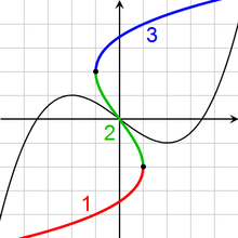 For a continuous function on the real line, one branch is required between each pair of local extrema. For example, the inverse of a cubic function with a local maximum and a local minimum has three branches (see the picture to the right).