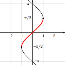 for every real x (and more generally sin(x + 2πn) = sin(x) for every integer n). However, the sine is one-to-one on the interval [–π⁄2, π⁄2], and the corresponding partial inverse is called the arcsine. This is considered the principal branch of the inverse sine, so the principal value of the inverse sine is always between –π⁄2 and π⁄2. The following table describes the principal branch of each inverse trigonometric function: