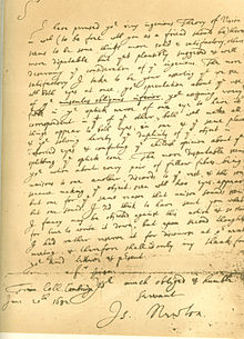 ... We went into the garden, & drank tea under the shade of some appletrees, only he, & myself. amidst other discourse, he told me, he was just in the same situation, as when formerly, the notion of gravitation came into his mind. "why should that apple always descend perpendicularly to the ground," thought he to him self: occasion'd by the fall of an apple, as he sat in a comtemplative mood: "why should it not go sideways, or upwards? but constantly to the earths centre? assuredly, the reason is, that the earth draws it. there must be a drawing power in matter. & the sum of the drawing power in the matter of the earth must be in the earths centre, not in any side of the earth. therefore dos this apple fall perpendicularly, or toward the centre. if matter thus draws matter; it must be in proportion of its quantity. therefore the apple draws the earth, as well as the earth draws the apple."