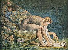 A statue of Isaac Newton, looking at an apple at his feet, can be seen at the Oxford University Museum of Natural History. A large bronze statue, Newton, after William Blake, by Eduardo Paolozzi, dated 1995 and inspired by Blake's etching, dominates the piazza of the British Library in London.