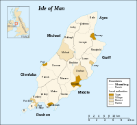 Local government on the Isle of Man is based on the concept of ancient parishes. There are two types of local authorities: a corporation for the Borough of Douglas, and bodies of commissioners for the town districts of Castletown, Peel and Ramsey, the village districts of Kirk Michael, Laxey, Onchan, Port Erin and Port St Mary, and the 15 'parish districts' (those parishes or parts of parishes which do not fall within the districts previously mentioned). Local authorities are under the supervision of the Isle of Man Government's Department of Local Government and the Environment (DOLGE).