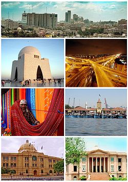 | Counterclockwise from top: Karachi Skyline, M.A. Jinnah Tomb, Karachi Sunday Textile Market, KPT headquarters, Sindh High Court, Kemari Boat Basin and Nagan Interchange | |||