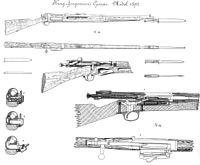 - M1896 Cadet Rifle, which was fitted with cleaning rod like M1892 rifle. Only about 400 were made before it was discontinued. The Cadet Rifle did not have sling swivels, and the lower band was retained by a band spring.