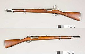 - The M1912 Carbine / M1912/16 Carbine / M1912/18 Carbine, "short rifle", was made after it became clear that the long barreled M1894 left something to be desired. The M1912 was adopted after experiments with shorter, thicker barrels and different projectiles. It differed from the earlier models by being stocked all the way to the muzzle; the bracket for the bayonet was moved from the barrel to under the stock. The M1912 carbine also featured an improved (strengthened) action which differed from the M/94 action on several points. It was soon clear that the nose band was too weak, which led to the /16 and /18 modifications of the basic design. A total of 30,118 were produced in the military serial number range between 1913 and 1926. It was also decided that any further production would be of this model. About 1592 M1912 were produced in a special serial number range for sale to civilians.