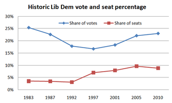 The first-past-the-post electoral system used in UK General Elections is not suited to parties whose vote is evenly divided across the country, resulting in those parties achieving a lower proportion of seats in the Commons than their proportion of the popular vote (see table and graph). The Lib Dems and their Liberal and SDP predecessors have suffered especially, particularly in the 1980s when their electoral support was greatest while the disparity between the votes and the number of MPs returned to parliament was significantly large. The increase in their number of seats in 1997, 2001 and 2005 was attributed to the weakness of the Conservatives and the success of their election strategist Lord Rennard. Lib Dems state that they want 'three-party politics' in the Commons; the most realistic chance of power with first past the post is for the party to be the kingmakers in a hung parliament. Party leaders often set out their terms for forming a coalition in such an event—Nick Clegg stated in 2008 that the policy for the 2010 general election is to reform elections, parties and Parliament in a "constitutional convention".
