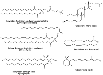 Lipids are broadly defined as any fat-soluble ( lipophilic), naturally-occurring molecule, such as fats, oils, waxes, cholesterol, sterols, fat-soluble vitamins (such as vitamins A, D, E and K), monoglycerides, diglycerides, phospholipids, and others. The main biological functions of lipids include energy storage, acting as structural components of cell membranes, and participating as important signaling molecules.