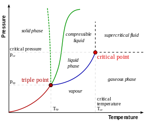 A typical phase diagram. The dotted line gives the anomalous behaviour of water. The green lines show how the freezing point can vary with pressure, and the blue line shows how the boiling point can vary with pressure. The red line shows the boundary where sublimation or deposition can occur.