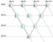 - Hyperons, such as the Λ, Σ, Ξ, and Ω particles, which contain one or more strange quarks, are short-lived and heavier than nucleons. Although not normally present in atomic nuclei, they can appear in short-lived hypernuclei.