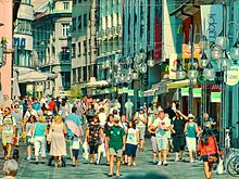 Ljubljana is located in the centre of the Slovenian motorway cross, which comprises the motorway route heading from east to west, in line with the Pan-European Corridor V, and the motorway route heading in the north–south direction, in line with the Pan-European Corridor X. The city is linked to the southwest by the A1-E70 to the Italian cities of Trieste and Venice and the Croatian port of Rijeka. To the north, A1-E57 leads to Maribor, Graz and Vienna. To the east, A2-E70 links it with the Croatian capital Zagreb, from where one can go to Hungary or important cities of the former Yugoslavia, such as Belgrade. To the northwest, A2-E61 goes to the Austrian towns of Klagenfurt and Salzburg, making it an important entry point for northern European tourists. A toll sticker system has been in use on the Ljubljana Ring Road since 1 July 2008. The center of the city is more difficult to access especially in the peak hours due to long arteries with traffic lights and a large number of daily commuters. The strict city centre has been closed for motor traffic since September 2007, except for residents with permissions.