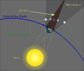 The shadow of the Earth can be divided into two distinctive parts: the umbra and penumbra. Within the umbra, there is no direct solar radiation. However, as a result of the Sun's large angular size, solar illumination is only partially blocked in the outer portion of the Earth's shadow, which is given the name penumbra.