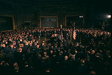 Johnson was honored with a state funeral in which Texas Congressman J. J. Pickle and former Secretary of State Dean Rusk eulogized him at the Capitol. The final services took place on January 25. The funeral was held at the National City Christian Church in Washington, D.C., where he had often worshiped as president. The service was presided over by President Richard Nixon and attended by foreign dignitaries, led by former Japanese prime minister Eisaku Satō, who served as Japanese prime minister during Johnson's presidency. Eulogies were given by the Rev. Dr. George Davis, the church's pastor, and W. Marvin Watson, former postmaster general. Nixon did not speak, though he attended, as is customary for presidents during state funerals, but the eulogists turned to him and lauded him for his tributes, as Rusk did the day before, as Nixon mentioned Johnson's death in a speech he gave the day after Johnson died, announcing the peace agreement to end the Vietnam War.
