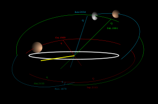 As of 2009, Makemake is at a distance of 52 astronomical units (7.8×109 km) from the Sun, almost as far from the Sun as it ever reaches on its orbit. Makemake follows an orbit very similar to that of Haumea: highly inclined at 29° and a moderate eccentricity of about 0.16. Nevertheless, Makemake's orbit is slightly farther from the Sun in terms of both the semi-major axis and perihelion. Its orbital period is nearly 310 years, more than Pluto's 248 years and Haumea's 283 years. Both Makemake and Haumea are currently far from the ecliptic—the angular distance is almost 29°. Makemake is approaching its 2033 aphelion, while Haumea passed its aphelion in early 1992.