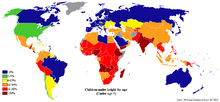 The World Health Organization estimates that malnutrition accounts for 54 percent of child mortality worldwide, about 1 million children. Even mild degrees of malnutrition double the risk of mortality for respiratory and diarrheal disease mortality and malaria. This risk is greatly increased in more severe cases of malnutrition. There are three commonly used measures for detecting malnutrition in children: stunting (extremely low height for age), underweight (extremely low weight for age), and wasting (extremely low weight for height). These measures of malnutrition are interrelated, but studies for the World Bank found that only 9 percent of children exhibit stunting, underweight, and wasting. According to a 2008 review an estimated 178 million children under age 5 are stunted, most of whom live in sub-Saharan Africa. A 2008 review of malnutrition found that about 55 million children are wasted, including 19 million who have severe wasting or severe acute malnutrition. Measurements of a child’s growth provide the key information for the presence of malnutrition, but weight and height measurements alone can lead to failure to recognize kwashiorkor and an underestimation of the severity of malnutrition in children.