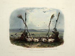 Upon the death of a family member, the people would erect a scaffold near the village to contain the body. The body would be placed with the head towards the northwest and feet to the southeast. Southeast is the direction of the Ohio River Valley, from which the Mandan came. The Mandan would not sleep in this orientation, because it invited death. After a ceremony to send the spirit away, the family would mourn at the scaffold for four days. After the body rotted and the scaffold collapsed, the bones would be gathered up and buried, except for the skull, which was placed in a circle near the village. Family members would visit the skulls and talk to them, sometimes bearing their problems or regaling the dead with jokes. After the Mandan moved onto the Fort Berthold Reservation, they resorted to placing the bodies in boxes or trunks, or wrapped them in fur robes and placed them in rocky crevices.
