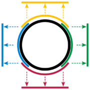 The top, bottom, left, and right charts show that the circle is a manifold, but they do not form the only possible atlas. Charts need not be geometric projections, and the number of charts is a matter of some choice. Consider the charts