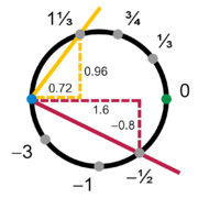 The top and right charts overlap: their intersection lies in the quarter of the circle where both the x- and the y-coordinates are positive. The two charts χtop and χright each map this part into the interval (0,1). Thus a function T from (0,1) to itself can be constructed, which first uses the inverse of the top chart to reach the circle and then follows the right chart back to the interval. Let a be any number in (0,1), then: