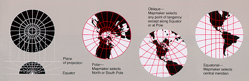 - Two-point equidistant: two "control points" are arbitrarily chosen by the map maker. Distance from any point on the map to each control point is proportional to surface distance on the earth.