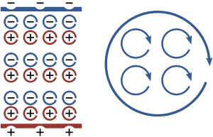 When an electric field is applied to a dielectric material its molecules respond by forming microscopic electric dipoles—their atomic nuclei move a tiny distance in the direction of the field, while their electrons move a tiny distance in the opposite direction. This produces a macroscopic bound charge in the material even though all of the charges involved are bound to individual molecules. For example, if every molecule responds the same, similar to that shown in the figure, these tiny movements of charge combine to produce a layer of positive bound charge on one side of the material and a layer of negative charge on the other side. The bound charge is most conveniently described in terms of a polarization, P, in the material. If P is uniform, a macroscopic separation of charge is produced only at the surfaces where P enter and leave the material. For non-uniform P, a charge is also produced in the bulk.