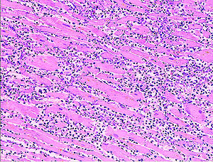 Although earlier changes can be discerned using electron microscopy, one of the earliest changes under a normal microscope are so-called wavy fibers. Subsequently, the myocyte cytoplasm becomes more eosinophilic (pink) and the cells lose their transversal striations, with typical changes and eventually loss of the cell nucleus. The interstitium at the margin of the infarcted area is initially infiltrated with neutrophils, then with lymphocytes and macrophages, who phagocytose ("eat") the myocyte debris. The necrotic area is surrounded and progressively invaded by granulation tissue, which will replace the infarct with a fibrous ( collagenous) scar (which are typical steps in wound healing). The interstitial space (the space between cells outside of blood vessels) may be infiltrated with red blood cells.