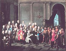 Yamacraw Creek Native Americans meet with the Trustee of the colony of Georgia in England, July 1734. The painting shows a Native American boy (in a blue coat) and woman (in a red dress) in European clothing.