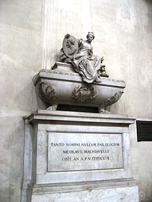 Machiavelli died in 1527 at the age of 58. He was buried at the Church of Santa Croce in Florence, Italy. An epitaph honoring him is inscribed on his monument. He died in his own establishment. The Latin legend reads: TANTO NOMINI NULLUM PAR ELOGIUM ("so great a name (has) no adequate praise" or "no eulogy (would be appropriate to) such a great name").