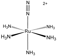 N2 forms a variety of adducts with transition metals. The first example of a dinitrogen complex is [Ru(NH3)5(N2)]2+ (see figure at right). However, it is interesting to note that the N2 ligand was obtained by the decomposition of hydrazine, and not coordination of free dinitrogen. Such compounds are now numerous, other examples include IrCl(N2)(PPh3)2, W(N2)2( Ph2PCH2CH2PPh2)2, and [(η5-C5Me4H)2Zr]2( μ2, η2,η2-N2). These complexes illustrate how N2 might bind to the metal(s) in nitrogenase and the catalyst for the Haber process. A catalytic process to reduce N2 to ammonia with the use of a molybdenum complex in the presence of a proton source was published in 2005.