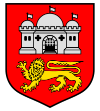 The city council's arms consist of a red shield on which is placed a silver domed castle above a royal lion. The blazon of the arms is: