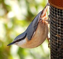 Nuthatches forage along tree trunks and branches and are members of the same feeding guild as woodpeckers. Unlike woodpeckers and treecreepers, however, they do not use their tails for additional support, relying instead on their strong legs and feet to progress in jerky hops. They are able to descend head-first and hang upside-down beneath twigs and branches. Krüper's Nuthatch can even stretch downward from an upside-down position to drink water from leaves without touching the ground. Rock nuthatches forage with a similar technique to the woodland species, but seek food on rock faces and sometimes buildings. When breeding, a pair of nuthatches will only feed within their territory, but at other times will associate with passing tits or join mixed-species feeding flocks.