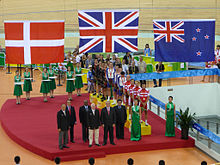 A medal ceremony is held after each Olympic event is concluded. The winner, second and third-place competitors or teams stand on top of a three-tiered rostrum to be awarded their respective medals. After the medals are given out by an IOC member, the national flags of the three medalists are raised while the national anthem of the gold medalist's country plays. Volunteering citizens of the host country also act as hosts during the medal ceremonies, as they aid the officials who present the medals and act as flag-bearers.