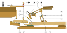 When the key is struck, a chain reaction occurs to produce the sound. First, the key raises the wippen, which forces the jack against the hammer roller (or "knuckle"). The hammer roller then lifts the lever carrying the hammer. The key also raises the damper; and immediately after the hammer strikes the wire it falls back, allowing the wire to resonate. When the key is released the damper falls back onto the strings, stopping the wire from vibrating. The vibrating piano strings themselves are not very loud, but their vibrations are transmitted to a large soundboard that moves air and thus converts the energy to sound. The irregular shape and off-centre placement of the bridge ensures that the soundboard vibrates strongly at all frequencies. (See Piano action for a diagram and detailed description of piano parts.)