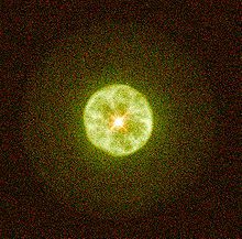 After the asymptotic giant branch (AGB) phase, the short planetary nebula phase of stellar evolution begins as gases drift away from the central star at speeds of a few kilometers per second. The central star is the remnant of its AGB progenitor, an electron-degenerate carbon-oxygen core that has lost most of its hydrogen envelope due to mass loss on the AGB. As the gases expand, the central star undergoes a two stage evolution, first growing hotter as it continues to contract and hydrogen fusion reactions occur in the shell around the core and then slowly cooling once the hydrogen shell is exhausted through fusion and mass loss. In the second phase, it radiates away its energy and fusion reactions cease, as the central star is not heavy enough to generate the core temperatures required for carbon and oxygen to fuse. During the first phase the central star maintains constant luminosity while, at the same time, it grows ever hotter, eventually reaching temperatures around 100,000 K. In the second phase, it eventually cools down so much that it does not give off enough ultraviolet radiation to ionize the increasingly distant gas cloud. The star becomes a white dwarf, and the expanding gas cloud becomes invisible to us, ending the planetary nebula phase of evolution. For a typical planetary nebula, about 10,000 years passes between its formation and recombination of the star.