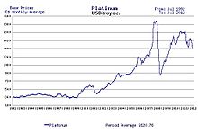 The price of platinum, like other industrial commodities, is more volatile than that of gold. In 2008, the price of platinum dropped from $2,252 to $774 per oz, a loss of nearly 2/3 of its value. By contrast, the price of gold dropped from ~$1,000 to ~$700/oz during the same time frame, a loss of only 1/3 of its value.