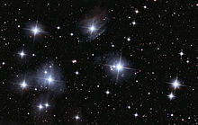 In astronomy, the Pleiades (pron.: / ˈ p l aɪ . ə d iː z / or / ˈ p l iː . ə d iː z /), or Seven Sisters ( Messier object 45 or M45), is an open star cluster containing middle-aged hot B-type stars located in the constellation of Taurus. It is among the nearest star clusters to Earth and is the cluster most obvious to the naked eye in the night sky. The name Pleiades comes from Greek mythology; the celestial entity has several meanings in different cultures and traditions.