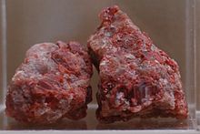 Orthoclase (potassium feldspar) is a common rock-forming mineral. Granite for example contains 5% potassium, which is well above the average in the Earth's crust. Sylvite (KCl), carnallite (KCl·MgCl2·6(H2O)), kainite (MgSO4·KCl·3H2O) and langbeinite (MgSO4·K2SO4)) are the minerals found in large evaporite deposits worldwide. The deposits often show layers starting with the least soluble at the bottom and the most soluble on top. Deposits of niter (potassium nitrate) are formed by decomposition of organic material in contact with atmosphere, mostly in caves; because of the good water solubility of niter the formation of larger deposits requires special environmental conditions.