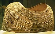 Burial practices in the Bronze Age differed from the communal tombs of the Neolithic period, with a change to burial in round barrows and the provision of grave goods. Inhumation was soon replaced by cremation and in Wales the cemetery mound with a number of burials had become the standard form by about 2000 BC. One of the most striking finds from Bronze Age Wales was the gold cape found in a tomb at Bryn yr Ellyllion, Mold, Flintshire dated to 1900-1600 BC, weighing 560 g and produced from a single gold ingot. Very few weapons have been found in Early Bronze Age graves in Wales compared with other objects, and the lack of traces of earlier Bronze Age settlements is thought to indicate that farms or hamlets were undefended.