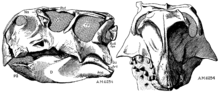 The skull of Psittacosaurus was highly modified compared to other ornithischian dinosaurs of its time. The skull was extremely tall in height and short in length, with an almost round profile in some species. The portion in front of the orbit (eye socket) was only 40% of total skull length, shorter than any other known ornithischian. The lower jaws of psittacosaurs are characterized by a bulbous vertical ridge down the centre of each tooth. Both upper and lower jaws sported a pronounced beak, formed from the rostral and predentary bones, respectively. The bony core of the beak may have been sheathed in keratin to provide a sharp cutting surface for cropping plant material. As the generic name suggests, the short skull and beak superficially resembled those of modern parrots. Psittacosaurus skulls shared several adaptations with more derived ceratopsians, such as the unique rostral bone at the tip of the upper jaw, and the flared jugal (cheek) bones. There was still no sign of the bony neck frill or prominent facial horns which would develop in later ceratopsians. Bony horns did protrude from the skull of P. sibiricus, but these are thought to be an example of convergent evolution.