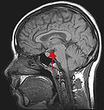 Image of the human brain. The arrow indicates the position of the hypothalamus.