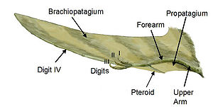 The pterosaur wing membrane is divided into three basic units. The first, called the propatagium ("first membrane"), was the forward-most part of the wing and attached between the wrist and shoulder, creating the "leading edge" during flight. This membrane may have incorporated the first three fingers of the hand, as evidenced in some specimens. The brachiopatagium ("arm membrane") was the primary component of the wing, stretching from the highly elongated fourth finger of the hand to the hind limbs (though where exactly on the hind limbs it anchored is controversial and may have varied between species, see below). Finally, at least some pterosaur groups had a membrane that stretched between the legs, possibly connecting to or incorporating the tail, called the uropatagium; the extent of this membrane isn't certain, as studies on Sordes seem to suggest that it simply connected the legs but did not involve the tail (rendering it a cruropatagium). It is generally agreed though that non-pterodactyloid pterosaurs had a broader uro/cruropatagium, with pterodactyloids only having membranes running along the legs; Pteranodon in particular might have developed/redeveloped an uropatagium, given the structure of the tail.