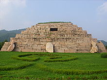 There are many square flat-topped mound tombs in China. The First Emperor Qin Shi Huang (circa 221 BCE, who unified the 7 pre-Imperial Kingdoms) was buried under a large mound outside modern day Xi'an. In the following centuries about a dozen more Han Dynasty royals were also buried under flat-topped pyramidal earthworks.