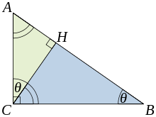 Let ABC represent a right triangle, with the right angle located at C, as shown on the figure. We draw the altitude from point C, and call H its intersection with the side AB. Point H divides the length of the hypotenuse c into parts d and e. The new triangle ACH is similar to triangle ABC, because they both have a right angle (by definition of the altitude), and they share the angle at A, meaning that the third angle will be the same in both triangles as well, marked as θ in the figure. By a similar reasoning, the triangle CBH is also similar to ABC. The proof of similarity of the triangles requires the Triangle postulate: the sum of the angles in a triangle is two right angles, and is equivalent to the parallel postulate. Similarity of the triangles leads to the equality of ratios of corresponding sides:
