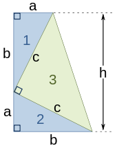 The third, rightmost image also gives a proof. The upper two squares are divided as shown by the blue and green shading, into pieces that when rearranged can be made to fit in the lower square on the hypotenuse – or conversely the large square can be divided as shown into pieces that fill the other two. This shows the area of the large square equals that of the two smaller ones.