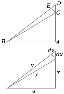 If x is increased by a small amount dx by extending the side AC slightly to D, then y also increases by dy. These form two sides of a triangle, CDE, which (with E chosen so CE is perpendicular to the hypotenuse) is a right triangle approximately similar to ABC. Therefore the ratios of their sides must be the same, that is: