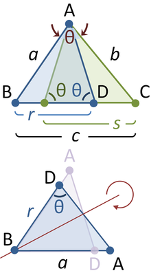 At any selected angle of a general triangle of sides a, b, c, inscribe an isosceles triangle such that the equal angles at its base θ are the same as the selected angle. Suppose the selected angle θ is opposite the side labeled c. Inscribing the isosceles triangle forms triangle ABD with angle θ opposite side a and with side r along c. A second triangle is formed with angle θ opposite side b and a side with length s along c, as shown in the figure. Tâbit ibn Qorra stated that the sides of the three triangles were related as: