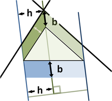 The lower figure shows the elements of the proof. Focus on the left side of the figure. The left green parallelogram has the same area as the left, blue portion of the bottom parallelogram because both have the same base b and height h. However, the left green parallelogram also has the same area as the left green parallelogram of the upper figure, because they have the same base (the upper left side of the triangle) and the same height normal to that side of the triangle. Repeating the argument for the right side of the figure, the bottom parallelogram has the same area as the sum of the two green parallelograms.
