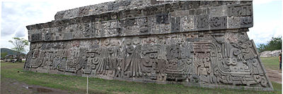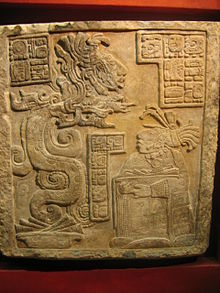In Xochicalco depictions of the feathered serpent is accompanied by the image of a seated, armed ruler and the hieroglyph for the day sign 9 Wind. The date 9 wind is known to be associated with fertility, venus and war among the Maya and frequently occurs in relation to Quetzalcoatl in other Mesoamerican cultures.