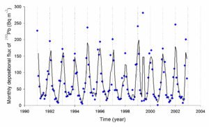 Radon (222Rn), when released into the air, decays to 210Pb and other radioisotopes, the levels of 210Pb can be measured. The rate of deposition of this radioisotope is weather dependent.