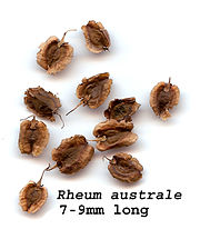 Rheum species are herbaceous perennials with hermaphrodite flowers, consisting of a colored perianth, composed of six to nine segments, arranged in two rows. The flowers have nine stamina inserted on the torus at the base of the peranthium, they are free or subconnatent at their base. The ovary is simple and triangular shaped with three styles. The fruits are a three-sided caryopsis with winged sides, the seeds are albuminous and have straight embryos.