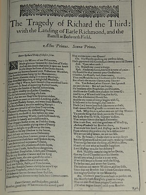 Richard III is a history play by William Shakespeare, believed to have been written in approximately 1591, depicting the Machiavellian rise to power and subsequent short reign of Richard III of England. The play is grouped among the histories in the First Folio and is most often classified as such. Occasionally, however, as in the quarto edition, it is termed a tragedy. Richard III concludes Shakespeare's first tetralogy (also containing Henry VI parts 1–3). It is widely considered to be one of Shakespeare's greatest plays.