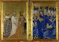 As part of Richard's programme of asserting his authority, he also tried to cultivate the royal image. Unlike any other English king before him, he had himself portrayed in panel paintings of elevated majesty, of which two survive: the over life-size Westminster Abbey portrait of the king (c. 1390, see top of page), and the Wilton Diptych (1394-99), a portable work probably intended to accompany Richard on his Irish campaign. It is one of the few surviving English examples of the courtly International Gothic style of painting that was developed in the courts of the Continent, especially Prague and Paris. Richard's expenditure on jewellery, rich textiles and metalwork was far higher than on paintings, but as with his illuminated manuscripts there are hardly any surviving works that can be connected with him, except for a crown, "one of the finest achievements of the Gothic goldsmith", that probably belonged to Anne.